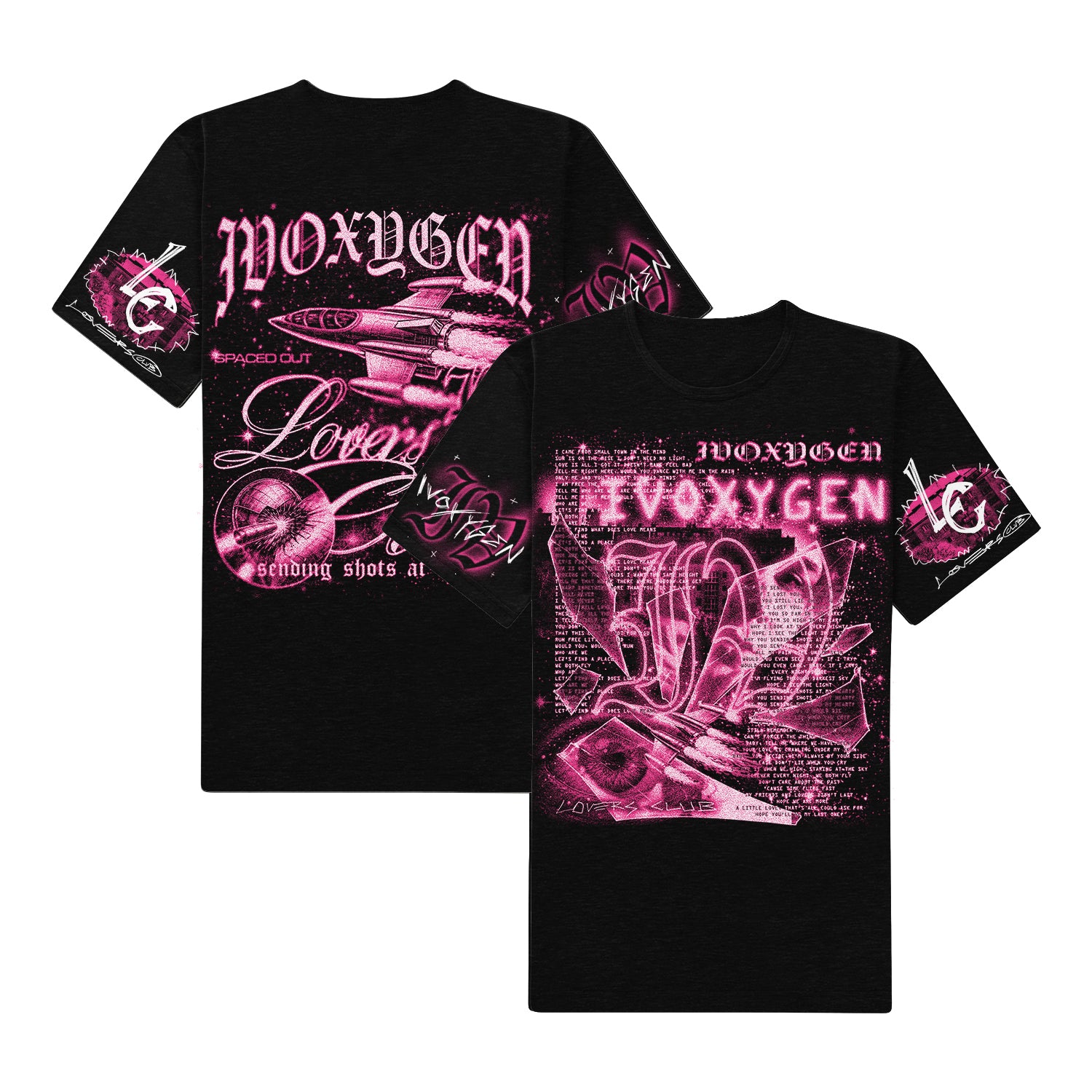 Black t-shirt illustrating 2020 single "Sending Shots at My Heart" with prints everywhere (front, back, both sleeves).
